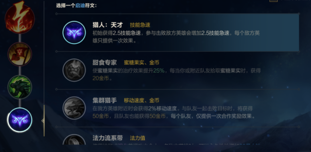 ④启迪符文选择 猎人:天才 初始获得2.5技能急速,参与击败敌方英雄会增加2.5技能急速,每个敌方英雄只提供一次效果。