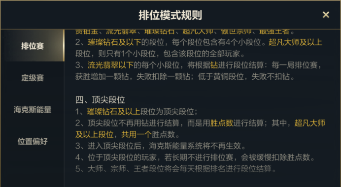 1、游戏中排位赛以钻石为界线,钻石以下升段是根据钻结算的,而钻石以上就需要用胜点来结算段位。