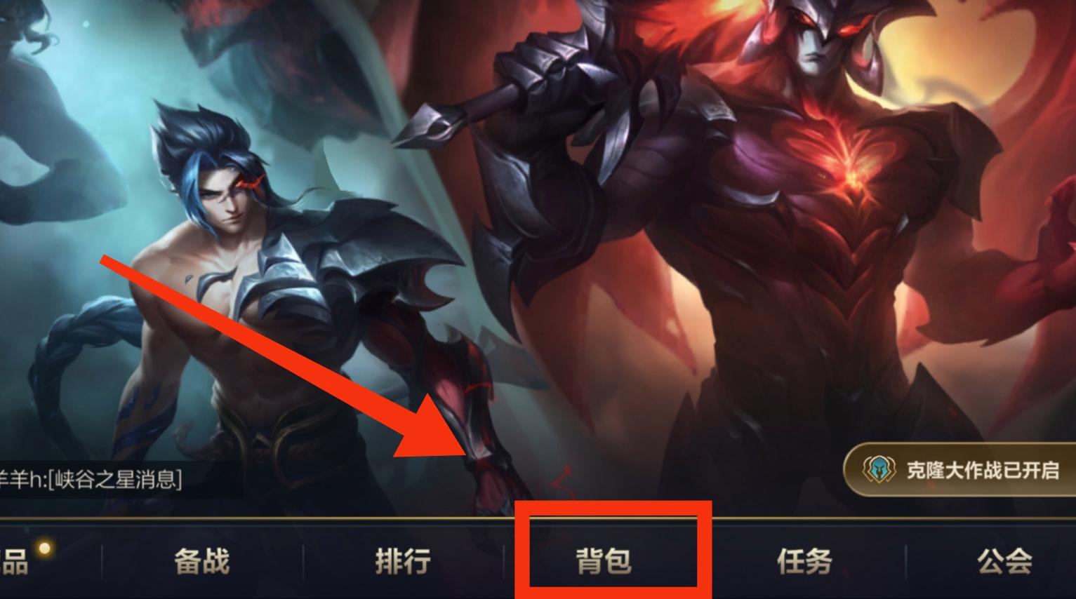 1.进入英雄联盟手游,在游戏首页点击最下面一排选项中的“背包”。如下图所示:
