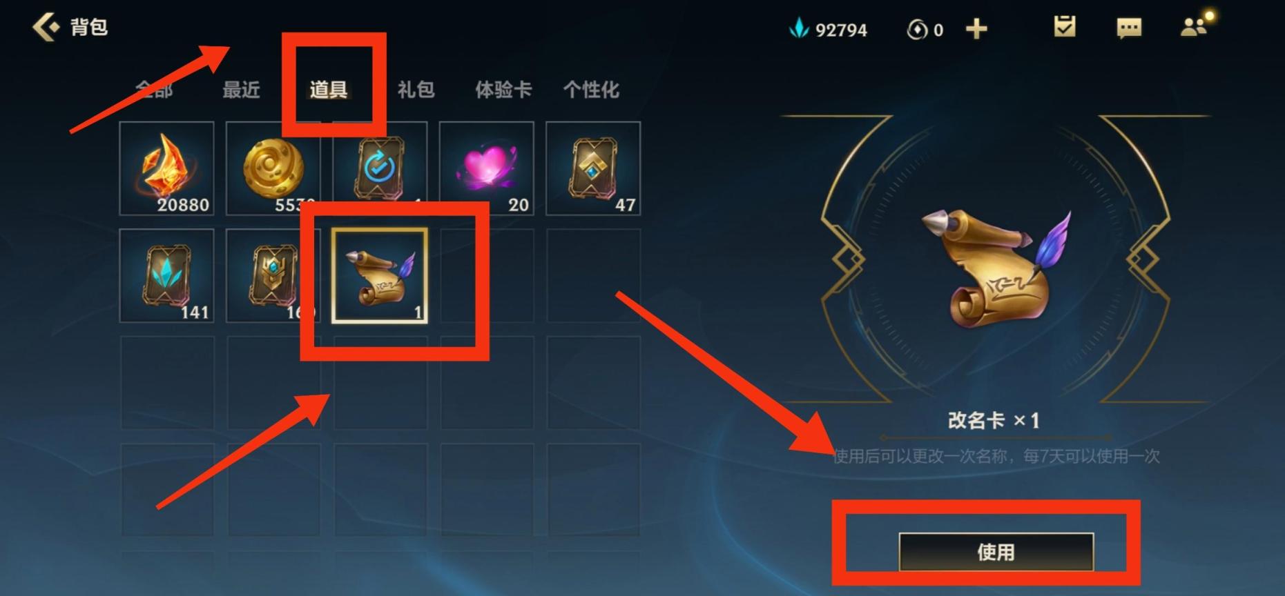 2.进入背包后,点击第三个选项“道具”,找到“改名卡”(没有改名卡的玩家可以在商城中购买)并点击,再点击右下角的“使用”。如下图所示: