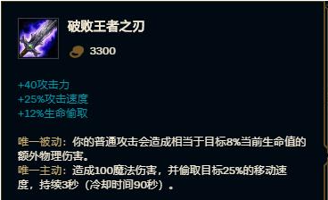 1、第一件先出破败王者之刃,可以提供吸血以及攻速,