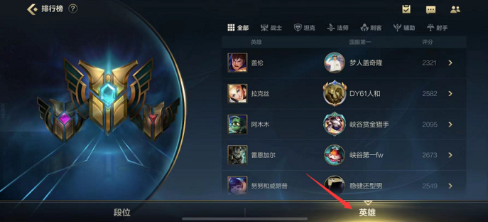 2.打开排行后选择右下方的英雄就可以看到英雄胜率排行了。
