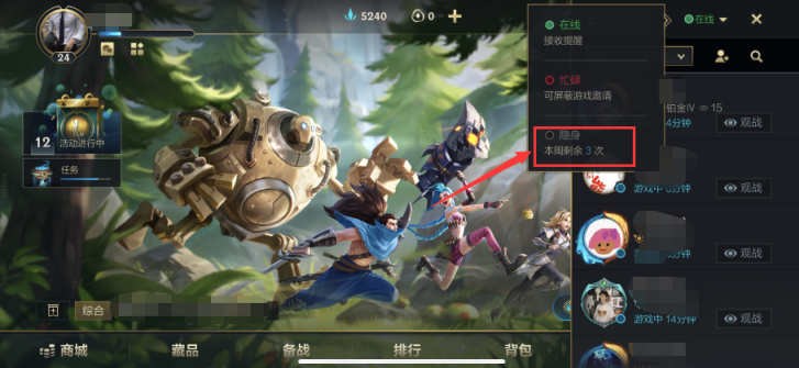 3.点击隐身即可完成隐身,要注意的是,每周只有三次隐身机会。