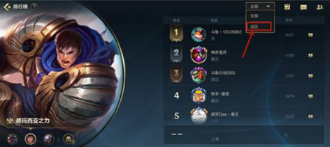1.大厅点击排行-英雄,这样就进入英雄排行榜了。点击排行榜页面任意英雄,选择左上角的全服,切换为战区。
