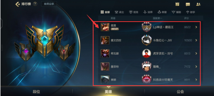 2、在排行榜界面点击英雄栏,找到自己所要查看的英雄排行