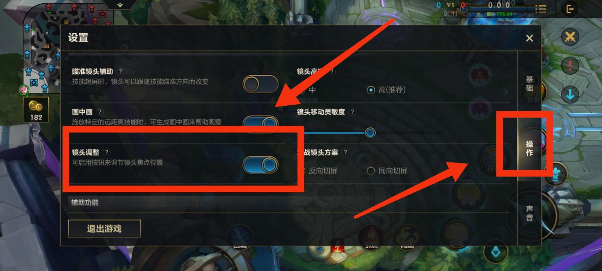 2.进入设置界面后,点击右侧的第二个选项“操作”,滑动界面找到“镜头调整”并开启。如下图所示: