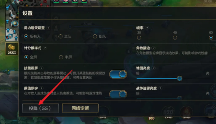 2、在设置的左下角就能看到“投降”两个字,后面的数字是时间,没有到投降的时候是不能发起投降的。如果在9分钟前就发起投降,那么需要所有队友点击同意才能成功投降,只要有一名玩家不同意则投降失败。如果在9分钟后点击投降,那么5名玩家中有3名以上的玩家选择了否,那么将投降失败。