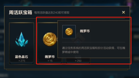 2、还可以在周活跃宝箱。也就是任务选项上方的宝箱获得,每周活跃可以获得三个宝箱的,分别可以获得10魄罗币、15魄罗币和25魄罗币。