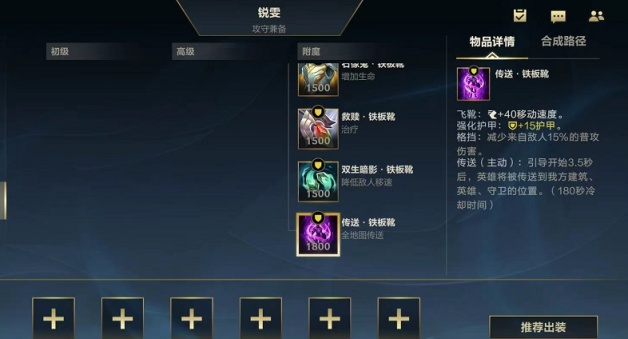 1、在英雄联盟手游中,传送在鞋子附魔中。