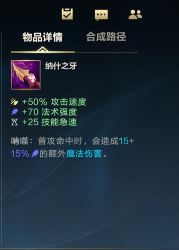 纳什之牙也是非常契合提莫的装备。增加攻速与减CD,能让我们更快打出伤害。而且它的被动是普通攻击命中敌人时造成额外15 15%法强的魔法伤害,咱们的每一次普通攻击都能触发效果,非常好用。