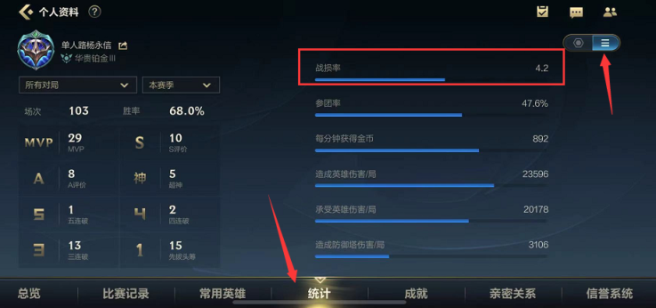 游戏主界面点击头像,选择统计,点击右上方三个横杠图标的标记就可以查看战损率,战损率就是自己的kda,也可以在左上方选择对局类型和赛季分别查看kda。