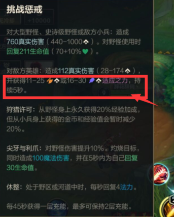 1、红色惩戒:对敌方英雄:造成112真实伤害( 28-174),并获得11-25的攻击力或16-30的适应之力,持续5秒。
