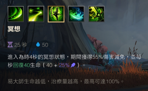 易大师的特殊技-高原血统,同样是分为主动和被动两种功能,被动技能让易大师在团战中总是扮演收割者的角色, 增加的攻速和免疫缓速赋予了易大师强力的追击能力,必要时也可用来免疫减速的软控制从而脱离战斗。