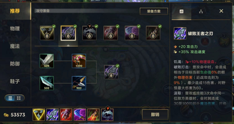 3:长剑出门,先做出三相之力,可以强化普攻增加移速,第二件再出破败,这两件装备提供了大量的攻速。两件套后可以出血手、死亡之舞等装备来提升武器的防御属性,然后根据局势选择一件纯防装。