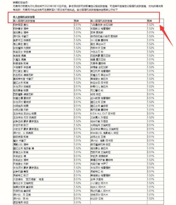 1.单人路随机皮肤宝箱:钢铁军团盖伦、钢铁意志潘森、猎龙勇士潘森、源代码卡蜜尔、皇家守卫菲奥娜、海上霸主盖伦、创世魔神内瑟斯、炼金狂士辛吉德、兔宝宝提莫、大魔王提莫等。详细皮肤及概率如下图所示: