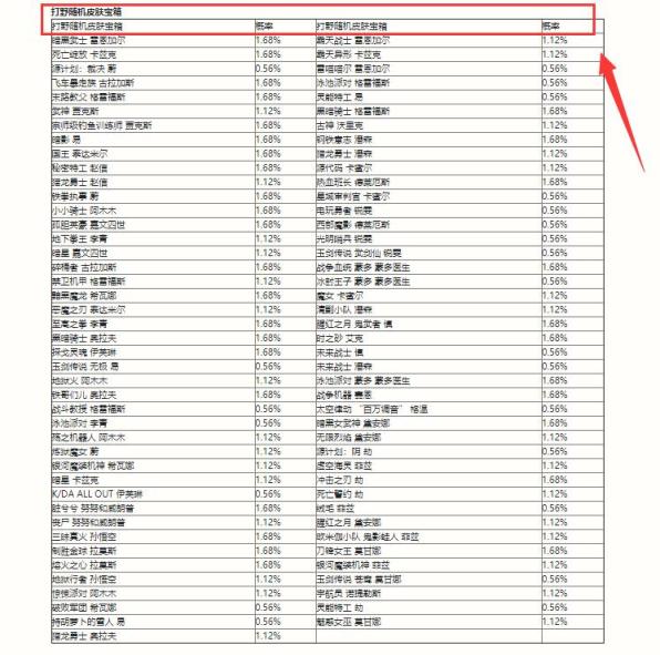 2.打野随机皮肤宝箱:暗黑武士雷恩加尔、死亡绽放卡兹克、源计划:裁决蔚、飞车暴走族古拉加斯、未路教父格雷福斯、武神贾克斯、宗师级钓鱼训练师贾克斯、暗影易、国王泰达米尔、秘密特工赵信、猎龙勇士赵信等。详细皮肤及概率如下图所示: