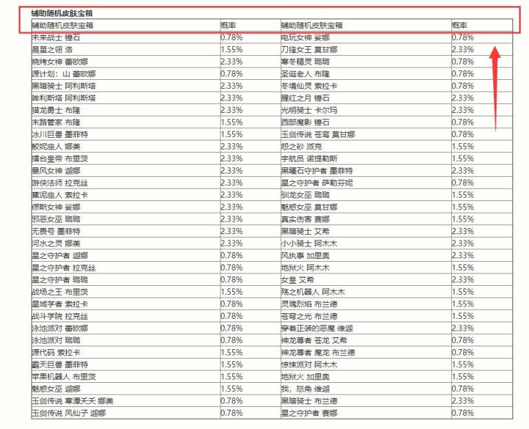 5.辅助随机皮肤宝箱:未来战士锤石、晨星之翎洛、烧烤女神蕾欧娜、源计划:山蕾欧娜、黑暗骑士阿利斯塔、眸利斯塔阿利斯塔、猎龙勇士布隆、末路管家布隆、冰川巨兽墨菲特、鲛妮座人娜美等。详细皮肤及概率如下图所示: