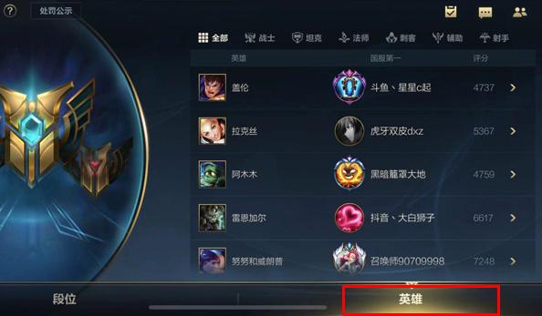 2.进入排行界面后,选择下方第二栏英雄进行切换,随便找一个英雄头像点进去。