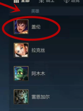 3.选择需要查看排名的英雄点击进入,如查看盖伦的英雄排名。