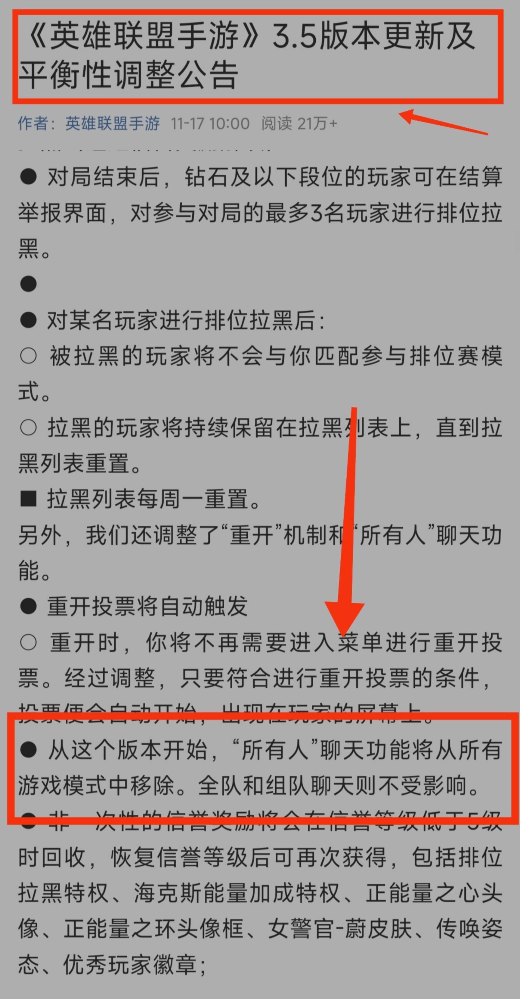 所有人聊天功能被移除了。根据英雄联盟手游“3.5版本更新及平衡性调整公告”可知,从3.5版本开始,“所有人”聊天功能将从所有游戏模式中移除。全队和组队聊天则不受影响。如下图所示:
