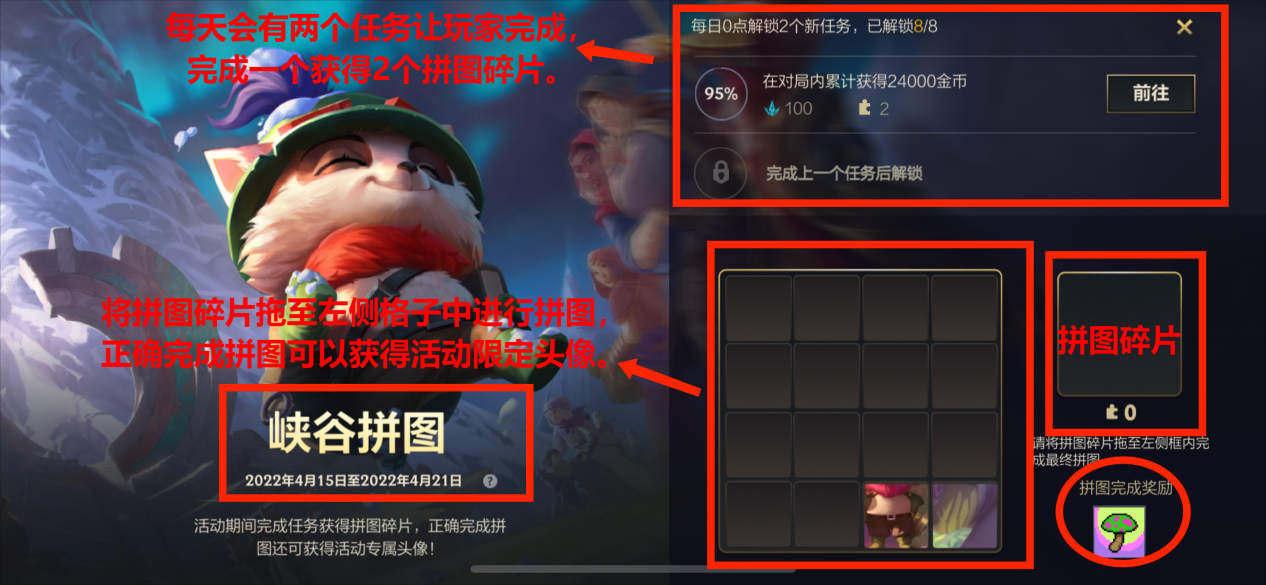 英雄联盟手游在4月15日开启了峡谷拼图的活动,玩家每天需要完成2个任务,完成1个任务可以获得2个拼图碎片,活动任务共8个,每日的0点会解锁两个新任务。完成最终拼图后,可以获得活动限定头像。