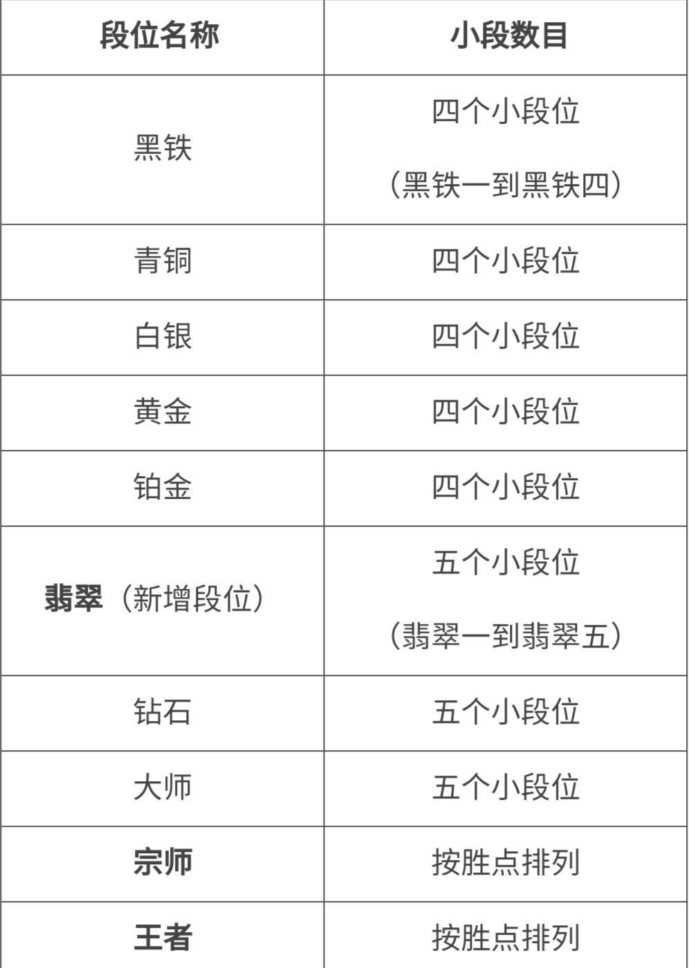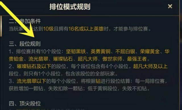 2.铂金及以下段位每一个段位都有四个小段位,如白金一、白金二、白金三、白金四等;而钻石及大师则是五个小段位;宗师及以上不分段位,以胜点进行排名,其中排名前200的直接就是王者。