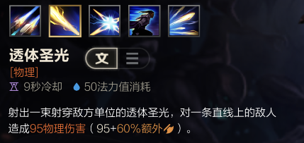 2、技能1:透体圣光。射出一束射穿敌方单位的透体圣光,对一条直线上的敌人造成95物理伤害,站位合适可以使用这个技能。
