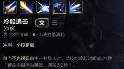 4、技能3:冷酷追击。这个技能是卢锡安的主要位移技能,施放该技能,卢锡安可以冲刺一小段距离。并且每当圣光银弹命中一名敌人时,该技能的CD就会减少1秒。请注意,若圣光银弹命中英雄,CD则减少2秒。3技能的存在,就导致了卢锡安的位移是所有AD英雄中,比较靠前的存在。