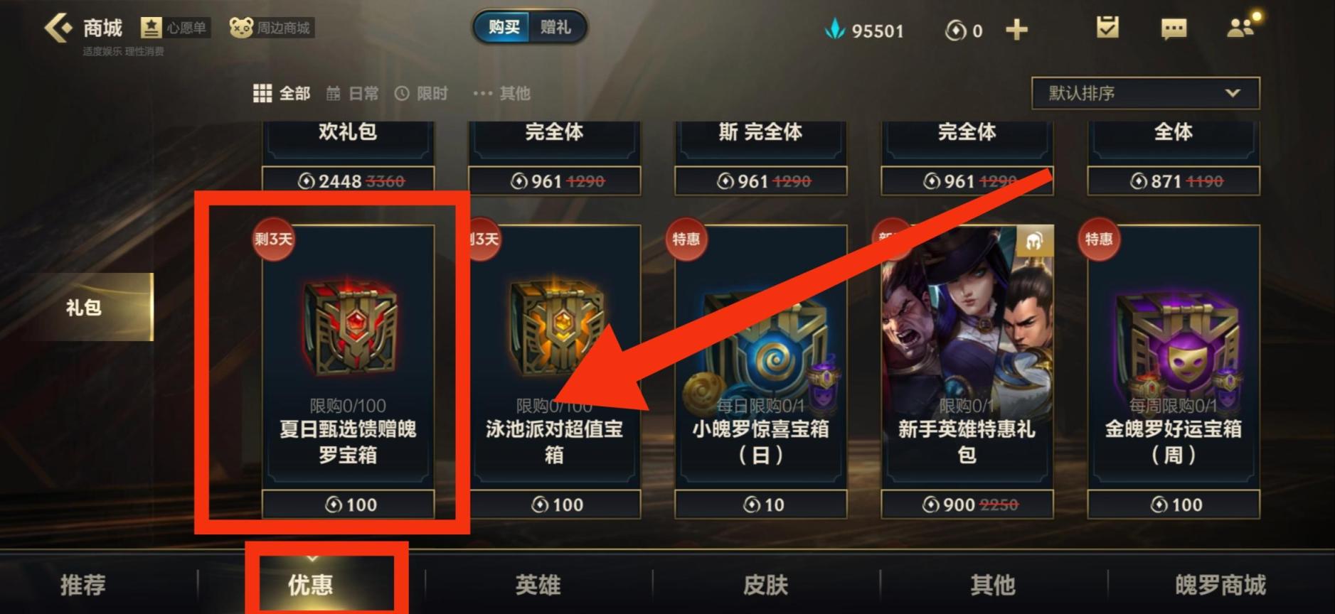 3.等进入商城后,先点击最下排第二个选项“优惠”,再在优惠界面下滑找到“夏日甄选馈赠魄罗宝箱”,点击进入并花100点券购买。如下图所示: