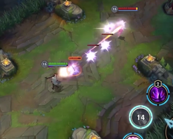 2.2、但是不要忘记烬还有一手大招超远距离狙击,大招在敌方残血较多或者需要先手开团留人的情况下非常实用,当然敌方抱团推塔的时候用来清理兵线也是不错的选择。