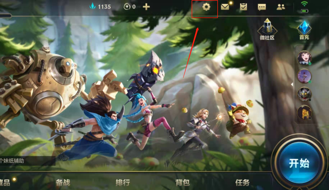 1.打开英雄联盟手游,在主界面中点击右上角的设置图标。