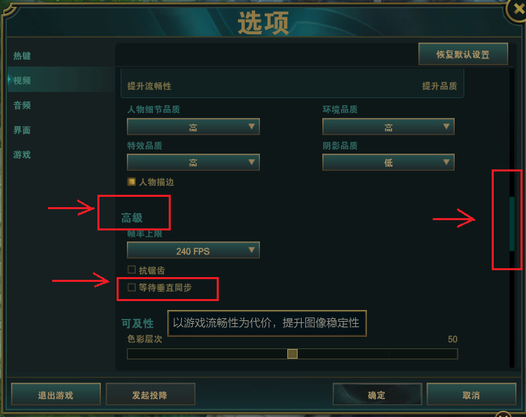 4、右端进度条往下拉,在“高级”选项下面就可以找到“等待垂直同步”选项了。