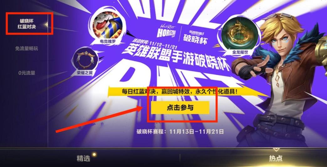 2、找到热点中的红晓杯红蓝对决,点击下图中的【立即参与】。