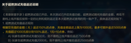 2.在超燃测试阶段充值金额小于1K的玩家,将会按照150%的比例进行返还,比如说充值100R,玩家就能返还1500点券;充值金额大于1K的玩家,超过1K的部分就会按照150%比例返还,比如说充值金额2K,玩家就能得到25000点券。