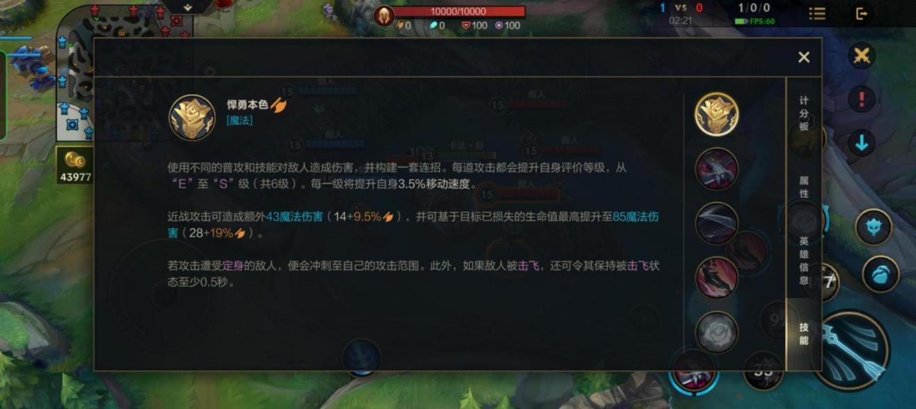 ①莎弥拉被动是悍勇本色,效果是:使用不同的普攻和技能对敌人造成伤害,并构建一套连招。每道攻击都会提升自身评价等级,从“E”至“S”级(共6级)。每一级将提升自身3.5%移动速度。近战攻击可造成额外魔法伤害,并可基于目标已损失的生命值最高提升若攻击遭受定身的敌人,便会冲刺至自己的攻击范围。此外,如果敌人被击飞,还可令其保持被击飞状态至少0.5秒。