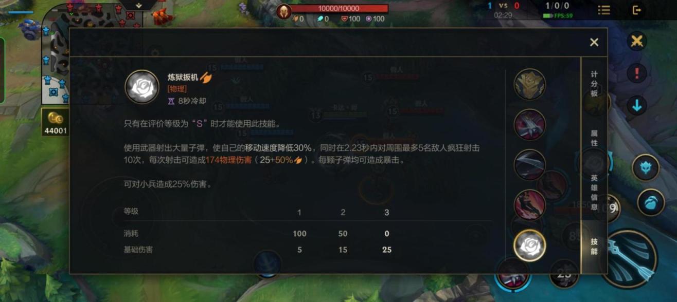 ⑤莎弥拉的大招是炼狱扳机,效果是:使用武器射出大量子弹,使自己的移动速度降低30%,同时在2.23秒内对周围最多5名敌人疯狂射击10次,每次射击可造成物理伤害。每颗子弹均可造成暴击。可对小兵造成25%伤害。只有在评价等级为“S”时才能使用此技能。