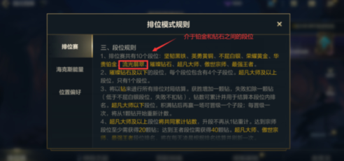 翡翠是位于铂金和钻石之间的段位,段位共有4个小段位,分别为翡翠Ⅰ、翡翠Ⅱ、翡翠Ⅲ和翡翠Ⅳ,每个小段位又分为5颗星,玩家小段位到达5颗星后就可以升上另一个小段位。此外,排位赛共有10个段位:坚韧黑铁、英勇黄铜、不屈白银、荣耀黄金、华贵铂金、流光翡翠、璀璨钻石、超凡大师、傲世宗师、最强王者。