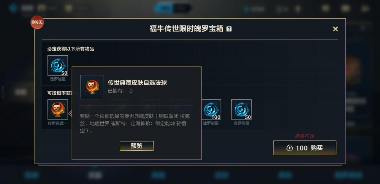 2、开启宝箱,有概率可以开出传世典藏皮肤自选法球,开出后使用即可选择兑换定海神珍孙悟空的皮肤。