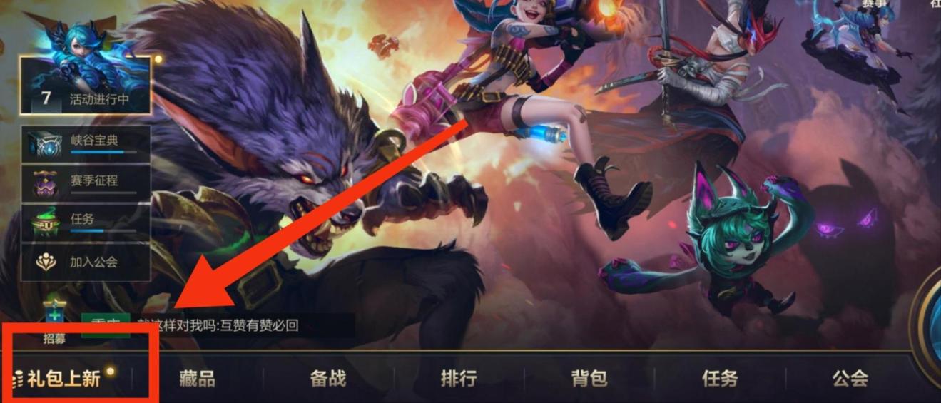 1.进入英雄联盟手游,在游戏首页点击左下角的“礼包上新”(商城),如下图所示: