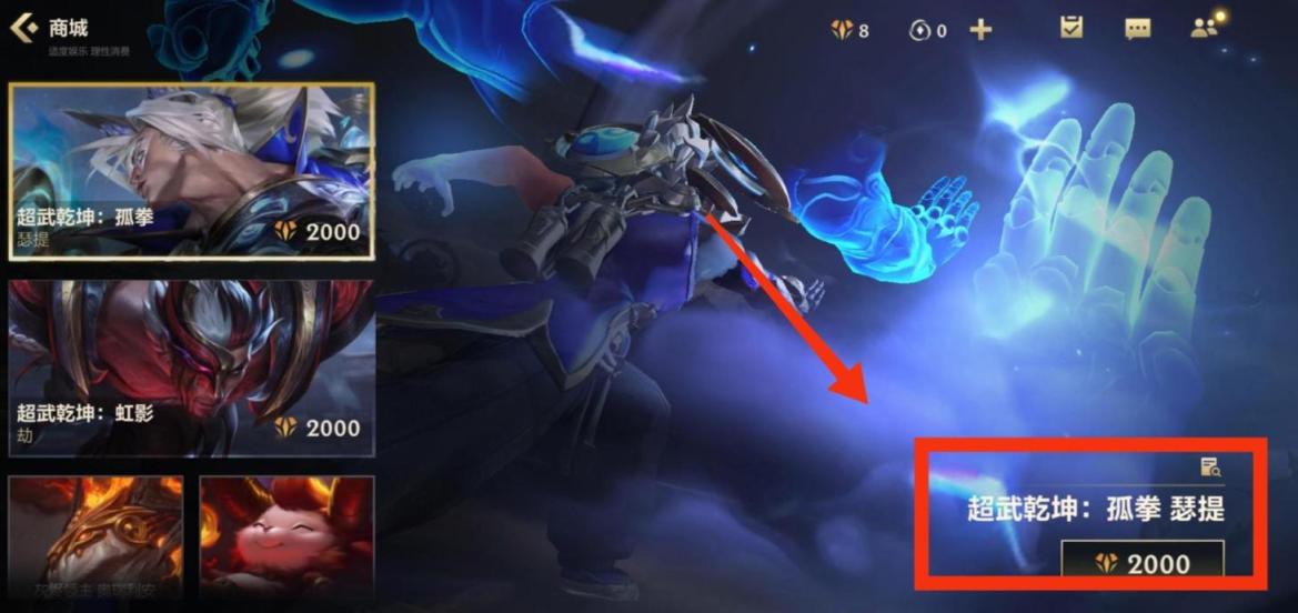 3.进入战利品商店界面后,就可以选择左侧的“超武乾坤”系列皮肤,再点击右下角的“2000”,使用2000橙色原石购买即可。如下图所示: