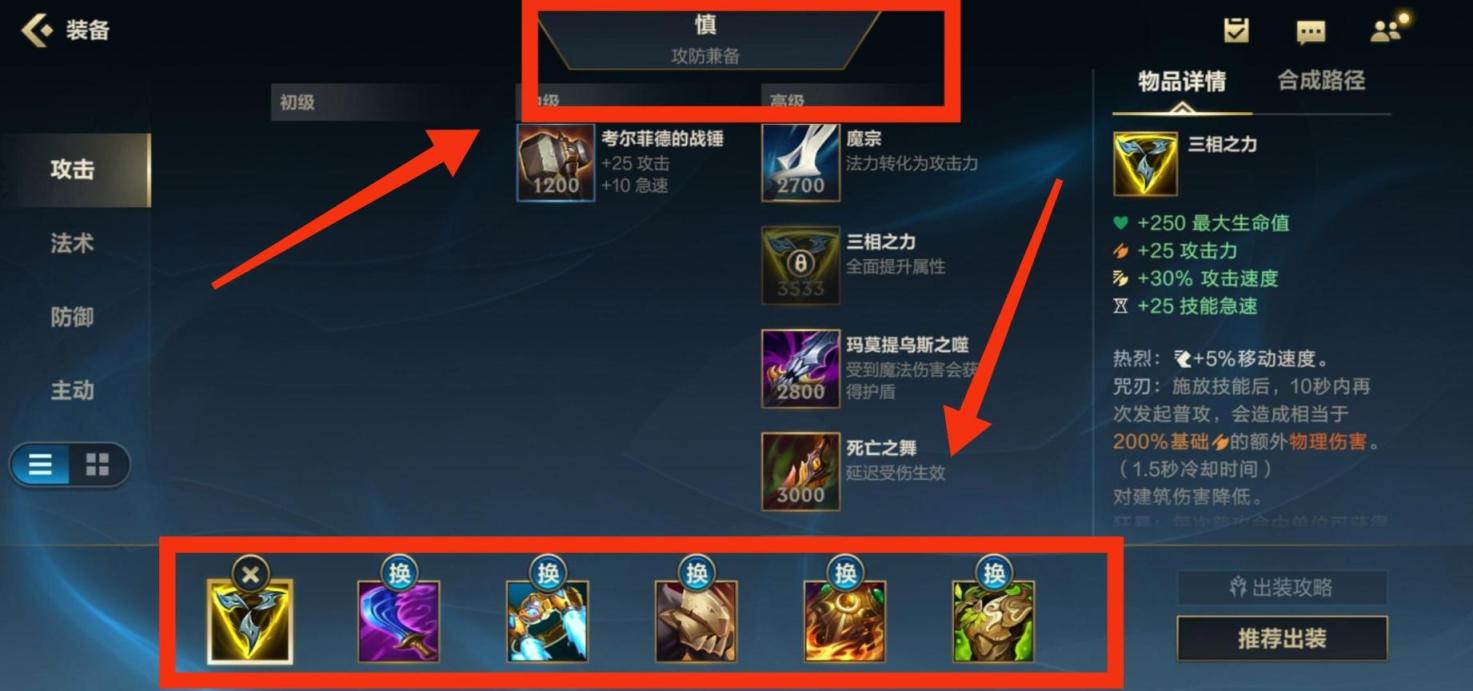 三相之力提供生命力、攻击力、攻速和技能急速加成;智慧末刃加攻速和魔抗,普攻命中造成额外魔法伤害;海克斯 水银之靴增加移速和魔抗;亡者的甲板提供生命值和护甲,可累计气势造成额外魔法伤害;日炎圣盾增加生命值和技能急速;狂徒铠甲增加生命值和回复生命值。如下图所示: