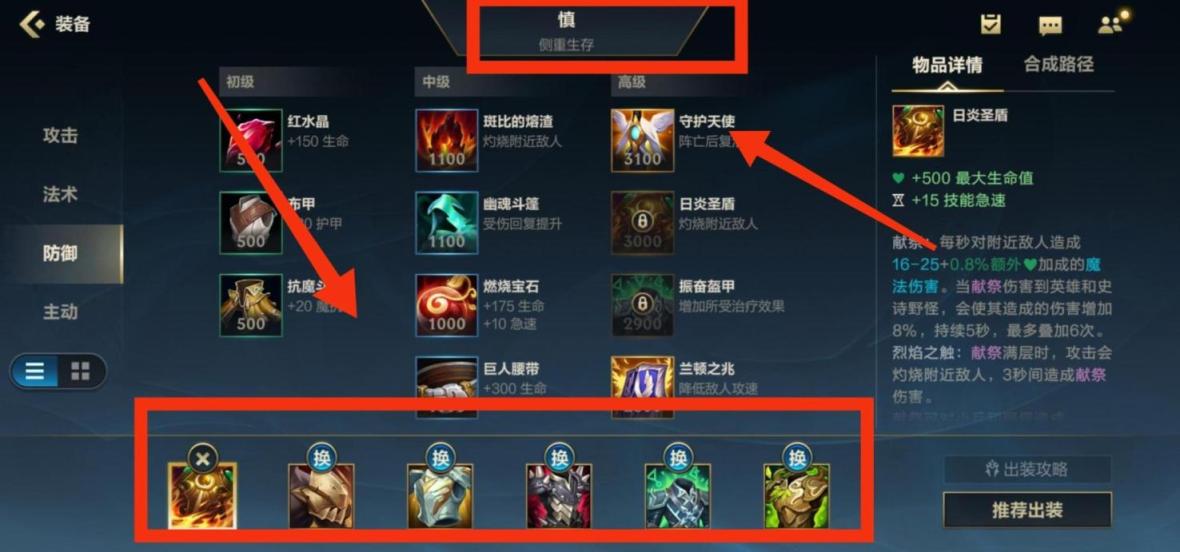 日炎圣盾增加生命值和技能急速;亡者的甲板提供生命值和护甲,可累计气势造成额外魔法伤害;石像鬼 铁板靴增加移速华人护甲,可以获得一道可吸收最大生命值30%的护盾;荆棘之甲增加生命值和护甲,可对攻击者造成重伤;振奋盔甲可增加生命值、基础生命回复、魔抗和技能急速;狂徒铠甲增加生命值和回复生命值。如下图所示: