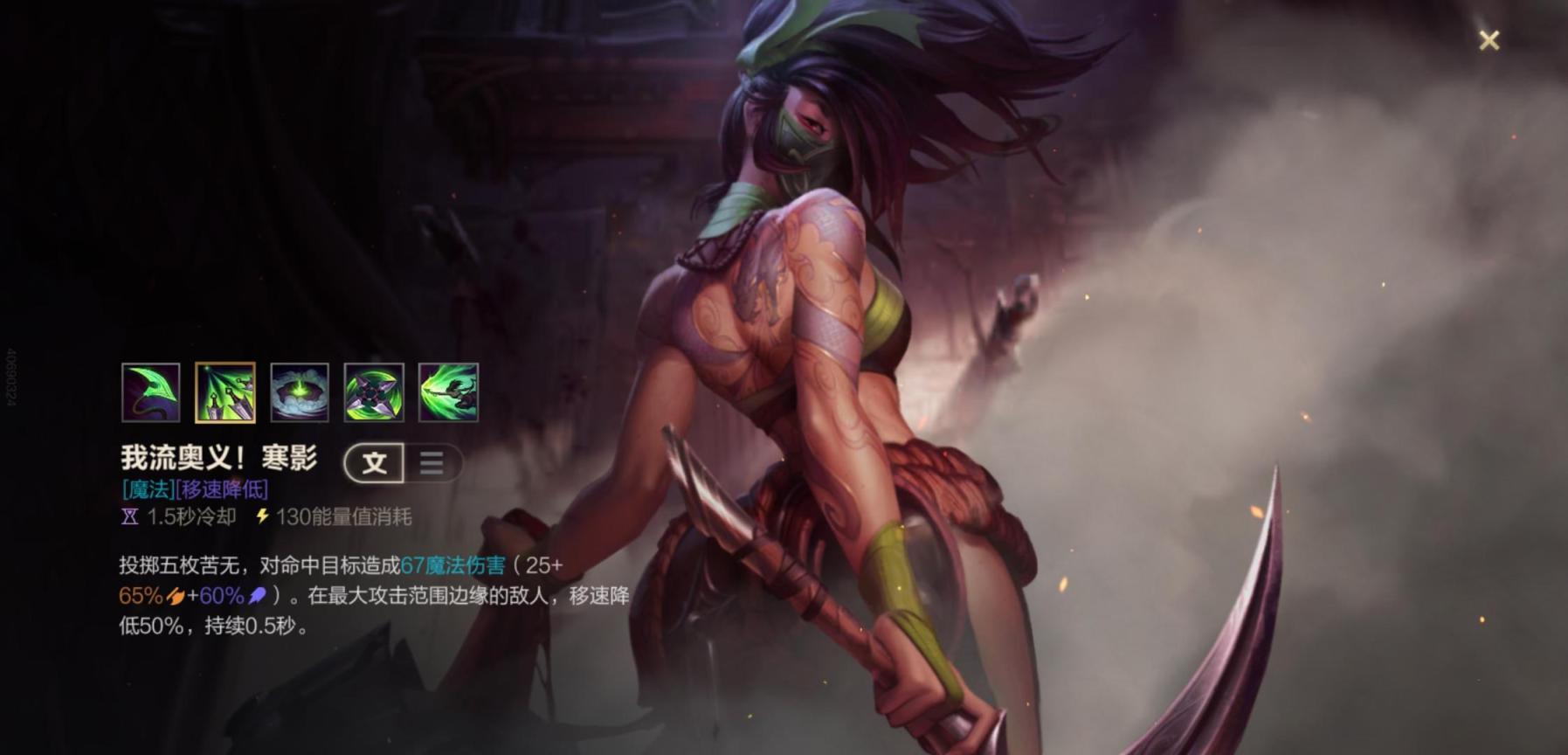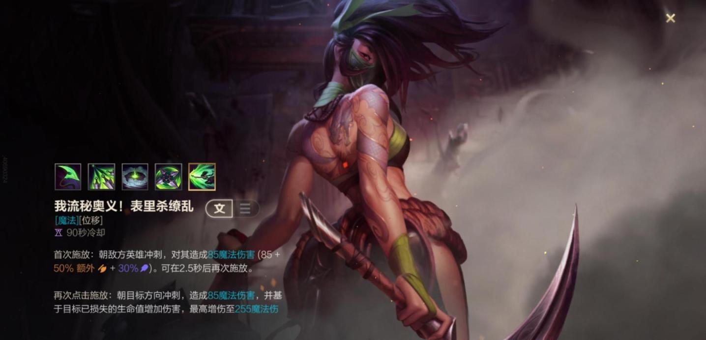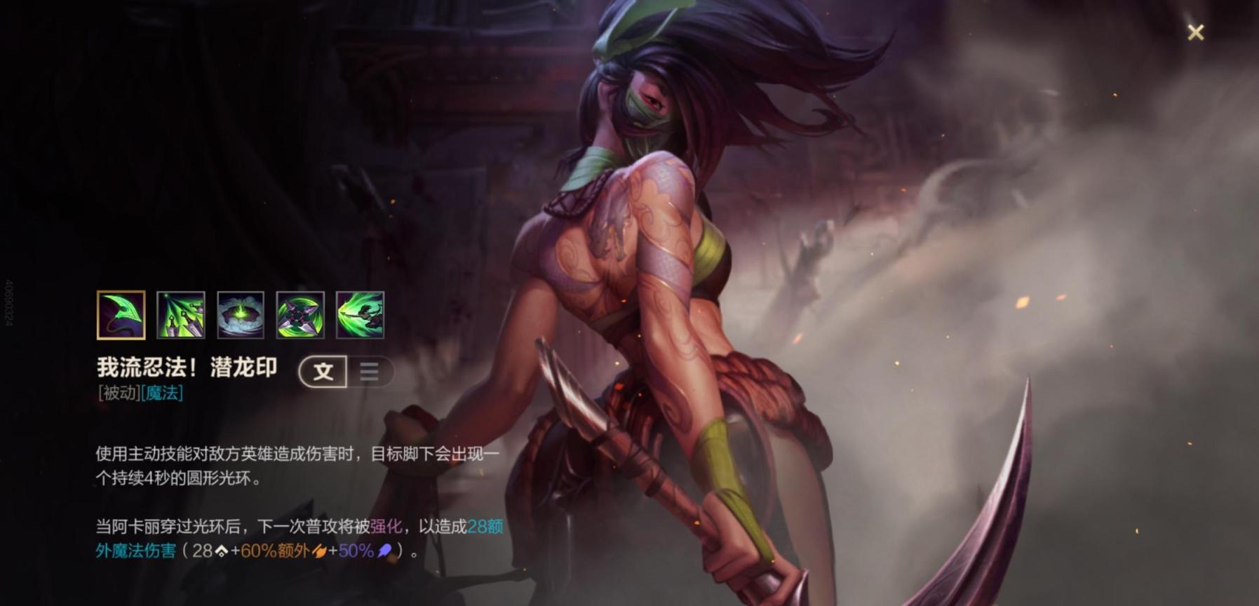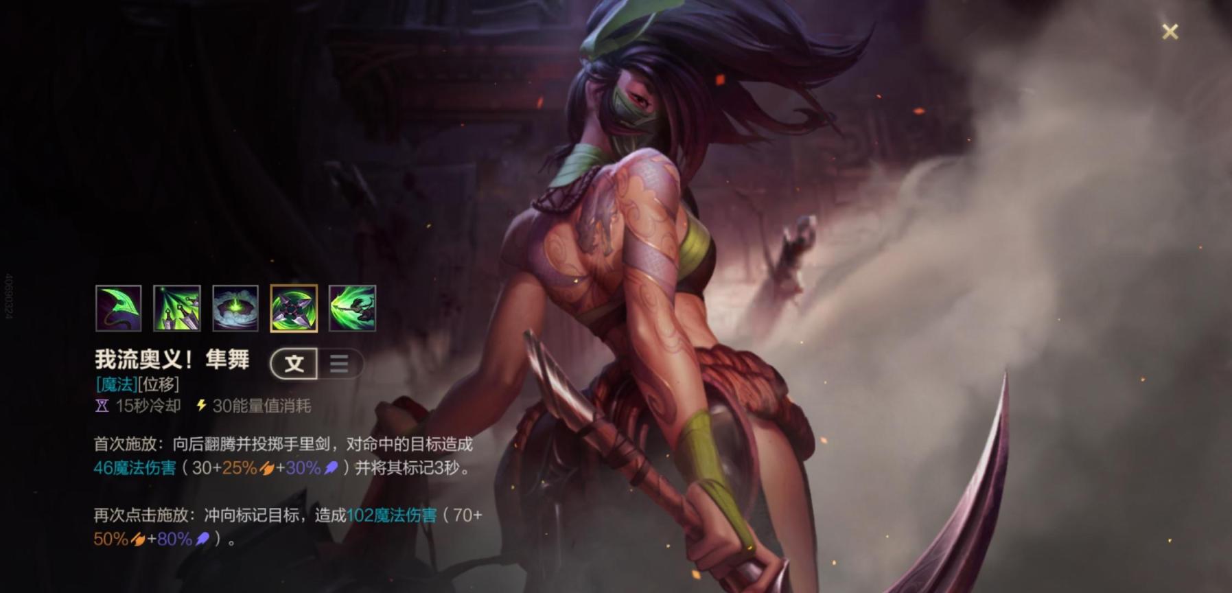 ①电击:配合阿卡丽的技能对敌人造成超高额的瞬间伤害。