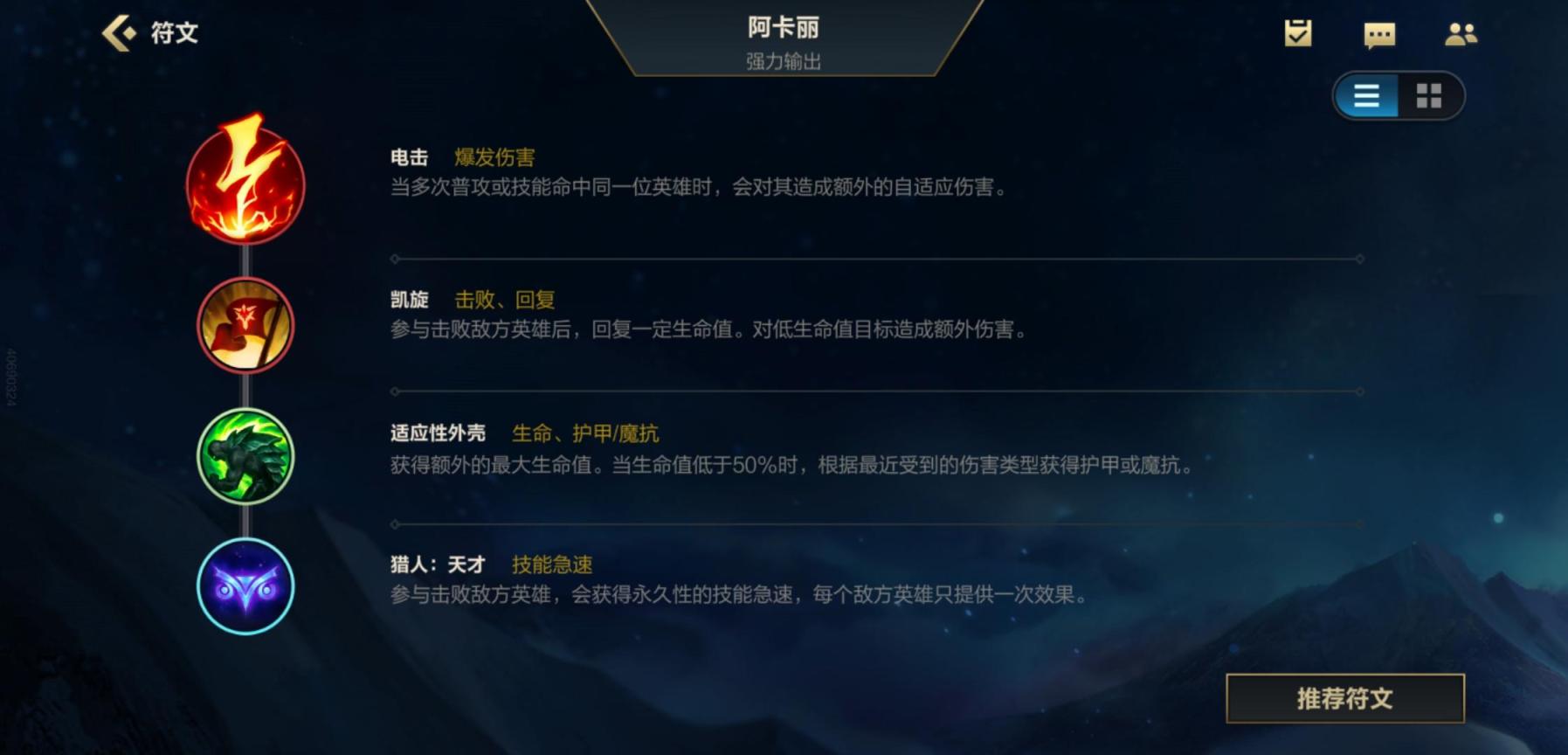 ②凯旋:凯旋带来的回血效果可以提高阿卡丽的团战续航能力。而对于低生命值敌人的收割效果则同样契合阿卡丽的大招,进一步增加伤害。③适应性外壳:在战斗中获得额外护甲或魔抗,防止被敌人秒杀。④猎人天才:技能急速的提高带来的是技能使用量的提高,变相增强了阿卡丽的战斗能力。8.召唤师技能推荐