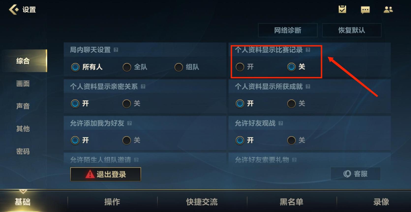 2、在设置中,找到【个人资料显示比赛记录】,就可以对战绩浏览权限进行设置。