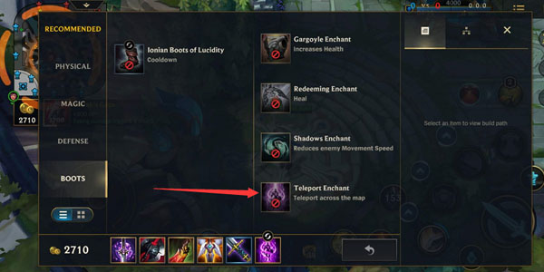 1、手游和端游是不一样,手游中传送不再是一个召唤师技能了,而是作为一件装备存在,玩家可以利用鞋子附魔,然后购买传送;