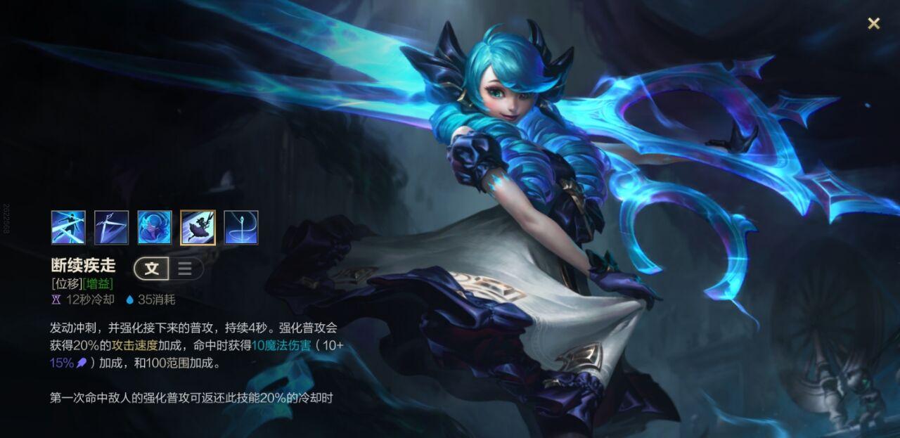 5、格温的三技能是一段位移,并强化接下来的普攻,增加攻速和攻击范围,命中时造成额外伤害,可以使用1技能 3技能的连招,调整1技能的输出位置。加点选择副升。