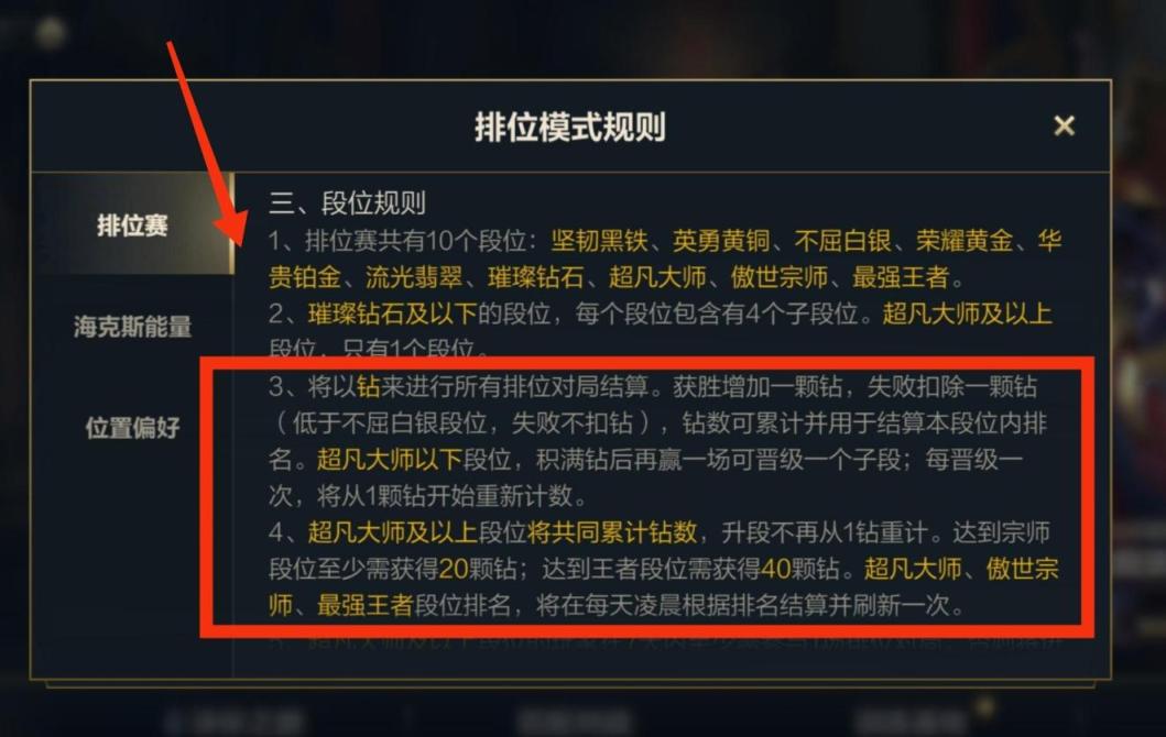 大师段位后至少需要20颗钻才可上宗师。从英雄联盟手游排位赛段位规则可知,排位赛以钻来进行玩家所有的排位对局结算。当玩家在超凡大师及以上段位时会共同累计钻数,升段就不同于超凡大师以下的段位从1钻重计。而达到宗师段位至少需要获得20颗钻。如下图所示: