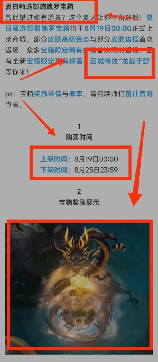 1.在英雄联盟手游中,回城特效黑龙指的是“龙战于野”回城特效,回城时英雄身边会盘旋一条黑色的龙,该回城特效出自“夏日甄选馈赠魄罗宝箱”,下架时间是8月25日23:59。如下图所示: