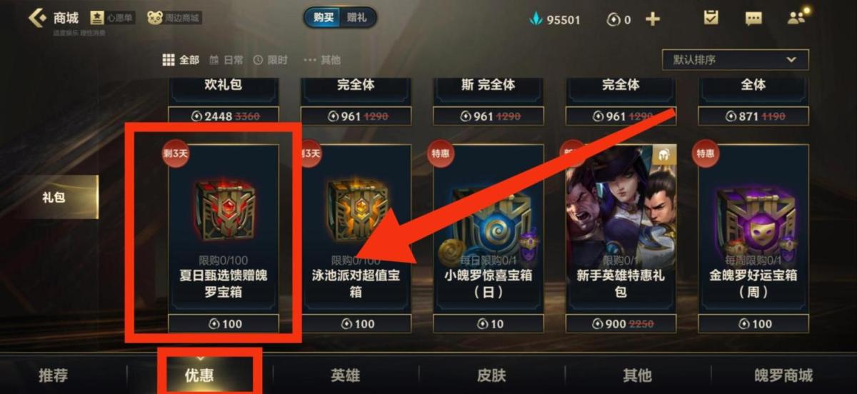 3.进入商城后,点击最下排选项中的“优惠”,再下滑界面找到“夏日甄选馈赠魄罗宝箱”,点击进入并花100点券购买。如下图所示:
